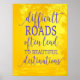 A beautiful motivational support message on a fabulous poster. The inspiring purple quote states "Difficult Roads often lead to beautiful destinations" on a yellow background.