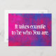 An inspirational quote on a vibrant abstract painted background. The background is a watercolor painting in magenta and blue done in abstract style with thick random brushstrokes. The quote says: it takes courage to be who you are in a big bold white grunge font.