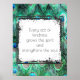 Poster with a wise inspirational motivational quotation which says: Every act of kindness grows the spirit and strengthens the soul. Set on a grungy style frame. The background is a pattern of peacock feathers. Colorful design in teal, jewel green, aqua blue and cobalt.