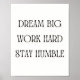 Inspire your daily routine with this minimalist and powerful motivational quote. Featuring the phrases 'Dream Big, Work Hard, Stay Humble', this clean typography design is perfect for home offices, workspaces, or as a meaningful gift for entrepreneurs and students.