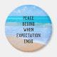 An inspirational quote which says: Peace begins when expectation ends. With a backdrop composed of a photograph of a clear blue ocean scene with gentle waves. Gentle idyllic seashore with soft warm inviting sand. A blue sky with fluffy clouds off in the distance. Serene tropical idyllic seascape.