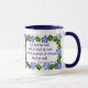 A white ringer mug with navy blue rim and handle. Mother Julian of Norwich's most famous saying, 'All shall be well, and all shall be well and all manner of things shall be well' is enclosed in a handpainted border of periwinkles on both sides. See also matching greeting card.