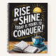 A spiral-bound notebook with a cover featuring muted watercolor illustration: A bright and uplifting morning scene with a warm golden sunrise casting a soft glow. The words 'Rise and shine, today is yours to conquer!' are displayed in bold, energetic lettering, filling the space with motivation. In the foreground, a steaming cup of morning coffee sits on a cozy wooden table, next to an open journal or a neatly stacked to-do list, symbolizing a fresh start. This is sketched on a chalkboard