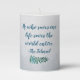 Beautiful candle with the touching quote from the Talmud, "He who saves one life saves the world entire." Blue script lettering, a lavender-blue bokeh background, decorated with blue-green blooms. Lovely gift idea!
