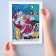 Musical ,whimsical and artistic watercolor painting with vibrant red ,blue, yellow, white colors by Bulgan Lumini (c).