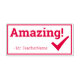 This motivating rubber stamp design features the motivating message "Amazing!" and a custom teacher name. It also features a decorative check mark icon. It could be used by a school teacher, educator, or tutor when marking assignments, to indicate that the student has done well.