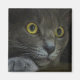 A close-up shot of the face of a grey cat with yellow eyes and dilated pupils, resting his head on his paw and staring intently at something behind the camera.