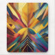 A vibrant array of bold, geometric shapes converges at the center, forming a symmetrical and colorful composition. The piece uses a variety of hues, ranging from warm yellows and oranges to cool blues and purples.