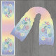 Beautiful scarf in muted rainbow colors with symbols of different religions and a labyrinth in the background. Suitable for an interfaith minister to use as a ceremonial stole.