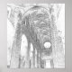 Cathedral interior etching showing columns, vaulted ceiling, statues and windows