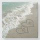 Elegant Sand Hearts written in the Beach nice to symbolize a Destination Wedding or tropical honeymoon travel vacation. Beautiful scenic image of clear aqua turquoise ocean water, with white waves crashing on the tan sand beach. Two interlocking hearts symbolize eternal love, even put your custom first or last name initials inside the hearts!