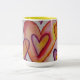 Watercolor painting of hearts interlocking with each other like love from life relationships. The colors are a soft lavender purple, pinks, red, yellows, and gold. This image is meant is a tribute to all those we love in our life. The interlocking love heart connections hold us together in joy and celebrations. It is love too for strengthening our souls for life's challenges. Personalize the heart mug with your own text and images using the Customize It option. Make special Valentine's Day, Wedding, Engagement, Baby, or Love custom mug gifts! Profits from this sale support the non-profit 501(c)3 DonnaBellas Angels.