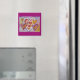 It was a bit smaller than expected, but I was too excited to check dimensions. The product itself send well printed though the grey text is a bit paint. Magnet worked perfectly on my fridge.