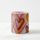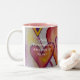 Watercolor painting of hearts interlocking with each other like love from life relationships. The colors are a soft lavender purple, pinks, red, yellows, and gold. This image is meant is a tribute to all those we love in our life. The interlocking love heart connections hold us together in joy and celebrations. It is love too for strengthening our souls for life's challenges. Personalize the heart mug with your own text and images using the Customize It option. Make special Valentine's Day, Wedding, Engagement, Baby, or Love custom mug gifts! Profits from this sale support the non-profit 501(c)3 DonnaBellas Angels.