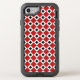 Safeguard your iPhone 8/7 with a shock-absorbing OtterBox case featuring a stylish interlocking pattern of red and white diamonds. Each white diamond contains a small black diamond adding depth to the original design. A circular window reveals the Apple logo on the back of the iPhone.