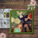 The background is rich in earth green and purple colors with green and purple shamrocks.