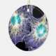 Two interphase cells with immunofluorescence labeling of actin filaments (purple), microtubules (yellow), and nuclei (green). This image won first place in the Nikon 2003 Small World photo competition.