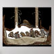 Group of gnomes walking through a snowy forest carrying their packs. Vintage illustration by Swedish artist John Bauer. Artwork from 1913.