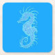 This stylized seahorse design by artist Jeff Bartels is decorated with intricate swirls and dot patterns. The seahorse is shown from the side with its head bent slightly downward and tail curled up into its body. This beautiful design is a striking representation of this strange and wonderful little sea creature.