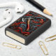 A beautifully crafted fireman's axe rests prominently on a vibrant backdrop filled with flowing patterns of red and black.