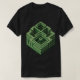 This unique t-shirt design features an intricate geometric maze rendered in shades of green. The maze is constructed with a series of interconnected, three-dimensional lines and shapes, creating a complex and visually engaging pattern. The design appears to rise and fall with a sense of depth, almost as if it is a small architectural structure. The varying shades of green add depth and contrast, enhancing the labyrinthine effect. Set against a solid black background, the maze stands out boldly, making this t-shirt a perfect choice for those who appreciate modern, abstract art and puzzles.