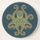 An intricate octopus design decorated with golden yellow swirls and dots. The symmetrical pattern has all eight of it’s legs outstretched and it’s eyes looking forward. The octopus sits on a deep blue background creating a subtle contrast on the surface of this coaster. The body and arms of the octopus are comprised of delicate lines that come together to form a stunning pattern. This stylish design is a beautiful take on this strange and wonderful sea creature.