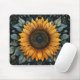 An artistic depiction of a large sunflower with detailed petals on a decorative dark background filled with leaves.