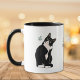 A black and white tuxedo cat stares at a blue butterfly as it flits by on this cute coffee mug. The image is printed on two sides, with the black text at the middle that says "Let LIFE INTRIGUE you". Your name is in script at the bottom. All the text may be customized, so you may change it to anything you'd prefer.