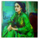 An AI-generated portrait of an introspective woman in a green dress
