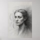 The subject's face is rendered with striking realism, characterized by deep, introspective eyes and a contemplative gaze that looks slightly off to the side. The high level of detail in her features and the subtle shading on her skin showcase exceptional technical skill.