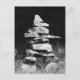 A striking black and white photograph of a rock inukshuk, used as a directional marker in historic times but now commonly seen on roadsides and in parks.