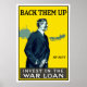 This vintage World War I poster features an older man, reaching into his pocket, as artillery and soldiers march behind him. It reads, "My Duty. Back them up, invest in the war loan".