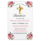 Celebre el bautismo o el bautizo de su hija con amigos y familiares invitándolos con este elegante imán de postal de invitación de bautismo floral dorado y rosa. Este diseño presenta una hermosa cruz de oro con un marco floral sobre un fondo blanco simple. Personaliza el texto y la fuente a tu gusto. Otras fuentes y estilos disponibles.