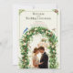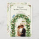 Featuring a romantic botanical wreath, soft natural tones, and a beautifully dressed couple, this template sets the perfect tone for your wedding day décor.