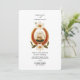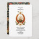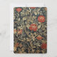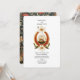 A classic Old World-style invitation featuring a regal medallion, flower laurel and two wedding rings. The back features a William Morris-esque navy blue floral print.