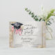 Watercolor floral graduation cap with pink bow, and gold frame on a gray and gold background.