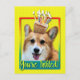 Invite your guests with this whimsical Corgi Dog Greeting Card. With a cupcake balanced on it's head, this design is sure to bring a smile and giggles! BTW, This design has several versions, with different background colors. There is also a Happy Birthday version.