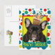 Invite your guests with this whimsical French Bulldog Dog Greeting Card. With a cupcake balanced on it's head, this design is sure to bring a smile and giggles! BTW, This design has several versions, with different background colors. There is also a Happy Birthday version.