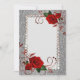 This invitation created on quality stock has faux silver glitter print on front with faux rhinestone-look border and red roses with red scrolls embellishment print. Plenty of space for you to custom add your text. Backside has faux silver glitter background with same large red roses scroll print at the top with room to add your personalized information. Customize or buy as shown for a handwritten touch.