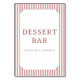 This wedding tabletop sign features a charming design with alternating pink and white vertical stripes framing the central cream background. The elegant serif typography highlights "DESSERT BAR" in bold, inviting guests to indulge with the phrase "PLEASE HELP YOURSELF!" below. The soft color palette and clean layout create a welcoming and modern aesthetic, perfect for adding a touch of vintage charm to your event. Ideal for guiding guests to sweet treats, this sign combines style and functionality seamlessly.
