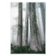 Fog descends into a forest. Three trees are grouped together among some ferns.