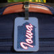 "Travel with Iowa patriotism using this durable luggage tag featuring the outline of the Hawkeye State! 🌽 Perfect for easily identifying your bags while showcasing your Iowa pride. A great way for Iowa residents, former residents, or anyone who loves its friendly communities and agricultural heritage to display their state spirit on every journey. Make your luggage stand out and show your Iowa patriotism! ❤️🌾