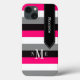 This personalized black, white, gray, and hot fuchsia pink Case-Mate Barely There iPad mini Retina display case has a wide bold striped background pattern and a black banner ribbon with white stitching that you can add your name, initials, monogram or other text to. This modern and trendy new case makes a chic statement for the hip young fashionista! If you need assistance, email niteowlstudio@gmail.com.