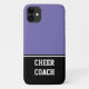 iPhone 11 case is shown in a purple & black color block style. Cheer Coach