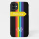 This personalized Case-Mate custom iPhone 11 case has a rainbow-colored vertical stripes pattern down the center with a yellow banner ribbon running horizontally below the camera that has white stitching and white lettering that you can customize with your name or other text. There is also a 3-letter monogram centered at the bottom. The black background can be changed to any color you want. You'll be proud to show off this modern and trendy new case that makes a chic statement! If you need assistance, email niteowlstudio@gmail.com.