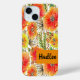 iPhone 15 Case with orange and yellow flowers and plants, with a touch of faux gold glitter. Thanks to the Hungryjpeg and Creative Fabrica for some of the elements in the design. The name on the phone can be changed.