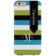 This personalized black, white, turquoise blue and olive green Case-Mate custom iPhone 6 Plus case has a wide striped background pattern and a black banner ribbon with white stitching that you can add your name, initials, monogram or other text to. This modern and trendy new case makes a chic statement for the hip young fashionista! If you need assistance, email niteowlstudio@gmail.com.