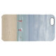 This iPhone case for iPhone 6 Plus features a beach scene. Two surfers, one male, one female, are heading from the beach into the ocean carrying their surf boards atop their heads. Their bright red shirts stand out against the blue-green ocean water. Off to one side is a lone swimmer.