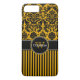 This personalized golden yellow and black Case-Mate custom iPhone 7 case has a damask and striped background pattern with a black and white band and circle to add your name, initials, monogram or other text to. This modern and trendy new case makes a chic statement for the hip young fashionista! If you need assistance, email niteowlstudio@gmail.com.