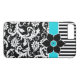 This personalized black and white Case-Mate custom iPhone 7 case has a floral damask and striped background pattern with an aqua blue and white band and flower with circle to add your initial, monogram or other text to. This modern and trendy new case makes a chic statement for the hip young fashionista! If you need assistance, email niteowlstudio@gmail.com.